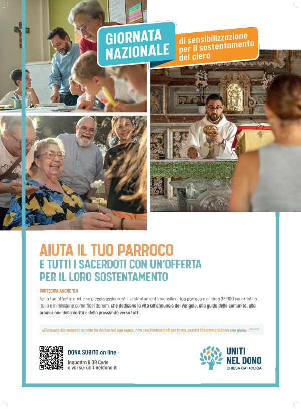 “La Giornata Nazionale – spiega il responsabile del Servizio Promozione per il Sostegno Economico alla Chiesa cattolica, Massimo Monzio Compagnoni – richiama l’attenzione sull’importanza della missione dei sacerdoti, sulla bellezza del loro servizio e sulla corresponsabilità richiesta alla comunità cattolica. È un’opportunità per esprimere gratitudine verso uomini di fede, speranza e prossimità, che ogni giorno offrono la loro vita per il bene delle comunità. Sostenerli non è solo un atto economico, ma un segno concreto di appartenenza e partecipazione ecclesiale”.