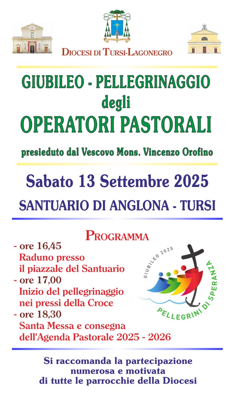 Sabato 13 Settembre 2025 presso il Santuario di Anglona in Tursi (MT) si terrà il Giubileo – Pellegrinaggio degli Operatori Pastorali, presieduto dal Vescovo Mons. Vincenzo Orofino.