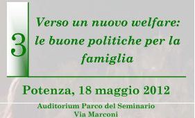 Il prossimo 18 maggio 2012, dalle ore 15,30 alle ore 19,00 si terrà a Potenza nell’auditorium del Seminario Minore il seminario per il Sud Verso un nuovo welfare: le buone politiche per la famiglia