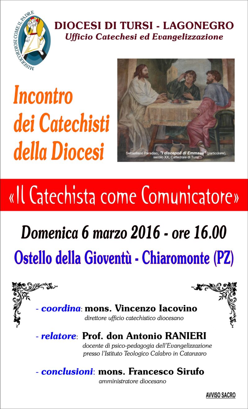 L’Ufficio Catechesi ed Evangelizzazione ha programmato per domenica 6 marzo 2016, con inizio alle ore 16.00, presso l’Ostello della Gioventù di Chiaromonte l’incontro dei Catechisti della Diocesi.