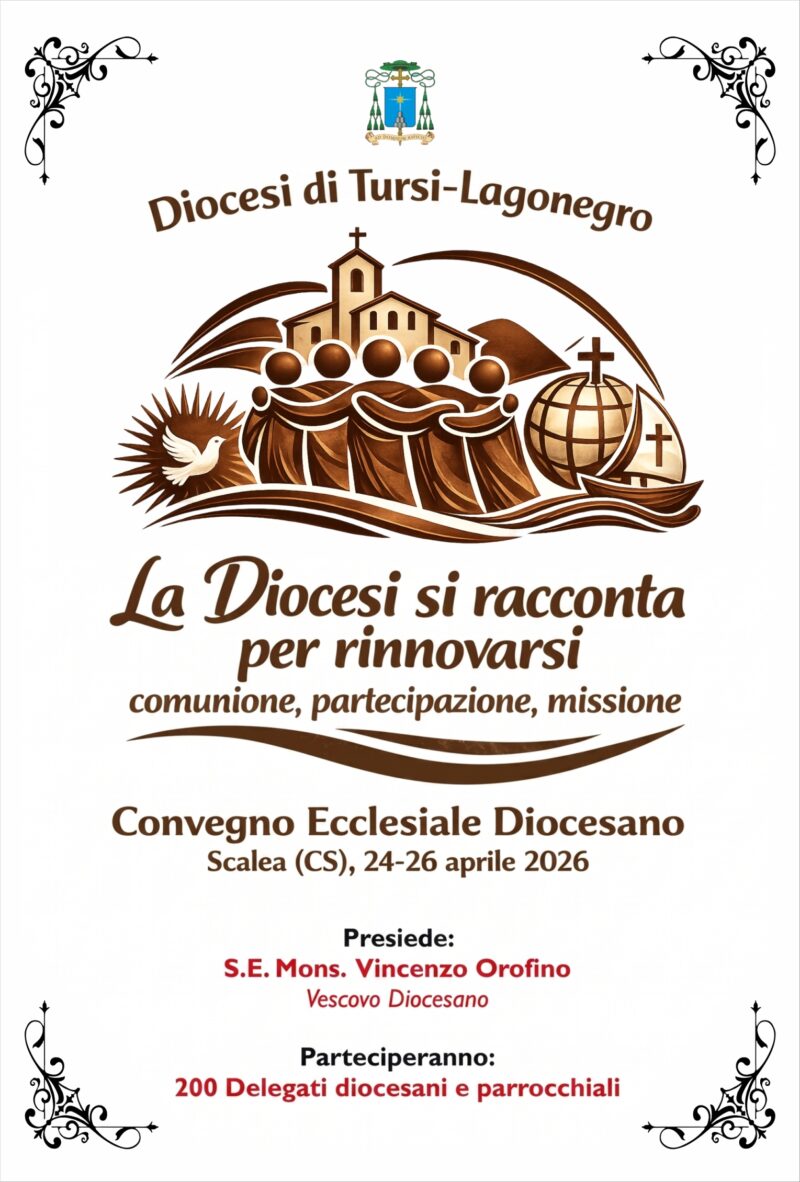 La Diocesi di Tursi-Lagonegro, guidata dal Vescovo S.E. Mons. Vincenzo Orofino, con duecento delegati diocesani e parrocchiali, si ritroverà a Scalea (CS), presso il Santa Caterina Village (Corso Mediterraneo n. 172), per vivere il Convegno Ecclesiale Diocesano, da venerdì 24 a domenica 26 aprile.